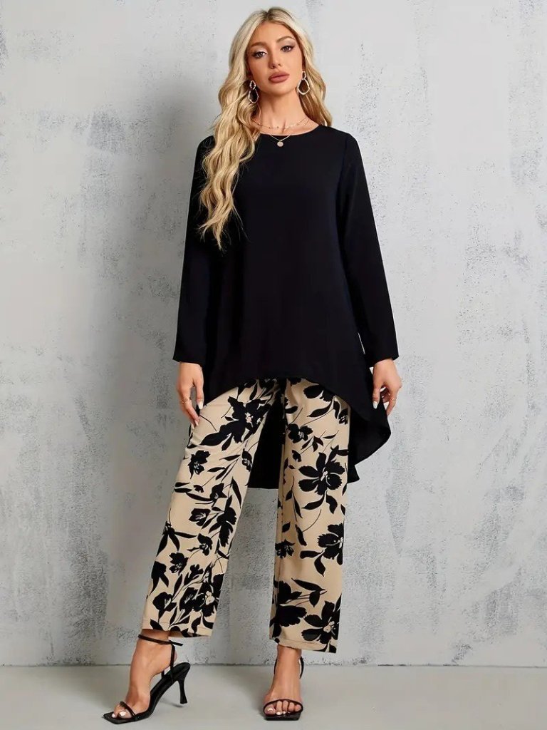 Kadın Uzun Kollu Bisiklet Yaka Asimetrik Kesim Detaylı Viskon Bluz Ve çiçek Desenli Iki Iplik Pantolon