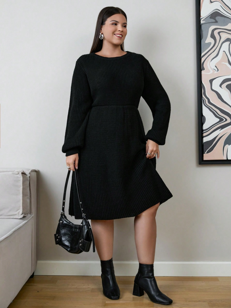 Kadın Uzun Kollu Bisiklet Yaka Eteği Kloş Triko Elbise