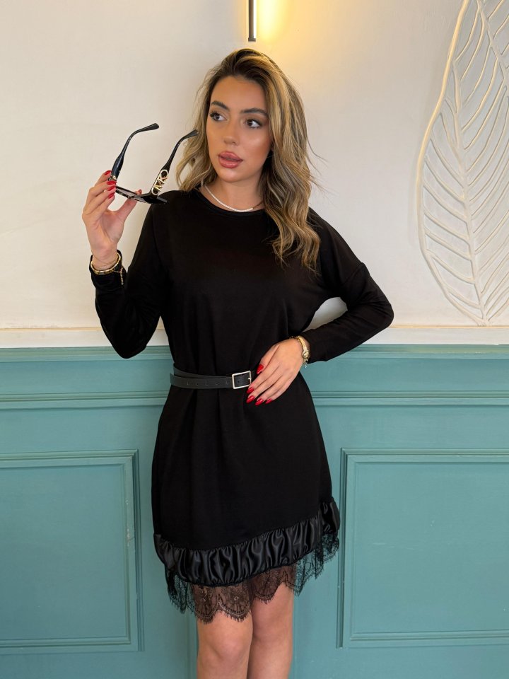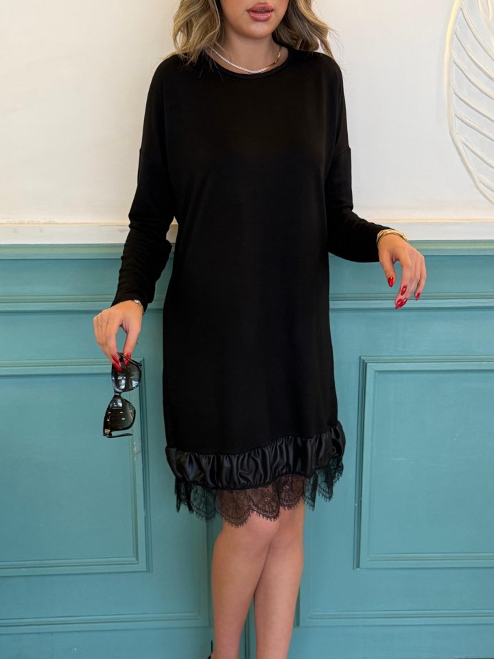 Kadın Uzun Kollu Bisiklet Yaka Etek Ucu Deri Ve Tül Detay Iki Iplik Mini Boy Elbise