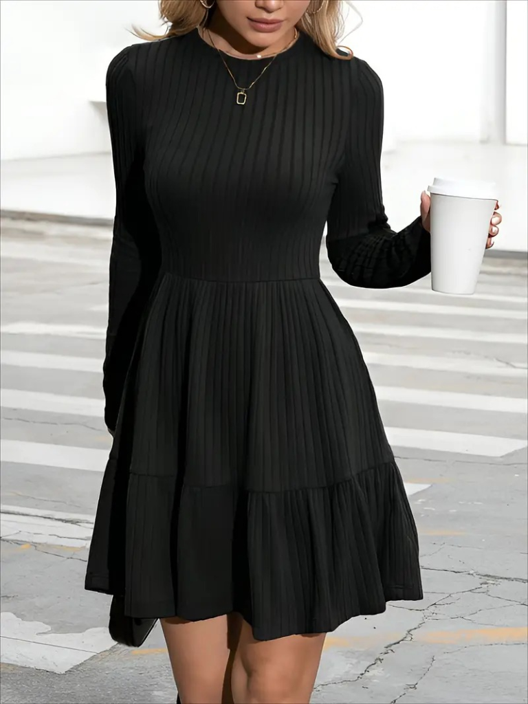 Kadın Uzun Kollu Bisiklet Yaka Katlı şardonlu Kaşkorse Kısa Elbise