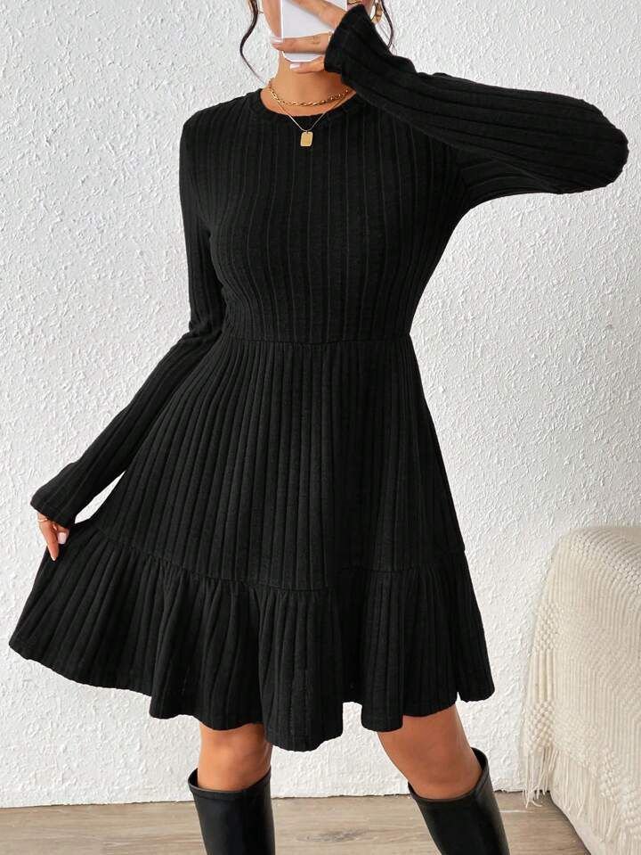 Anasayfa Kadın Kadın Uzun Kollu Bisiklet Yaka Kemersiz Eteği Pileli şardonlu Kaşkorse Elbise