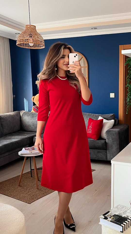 Kadın Uzun Kollu Bisiklet Yaka Midi Ithal Krep Elbise
