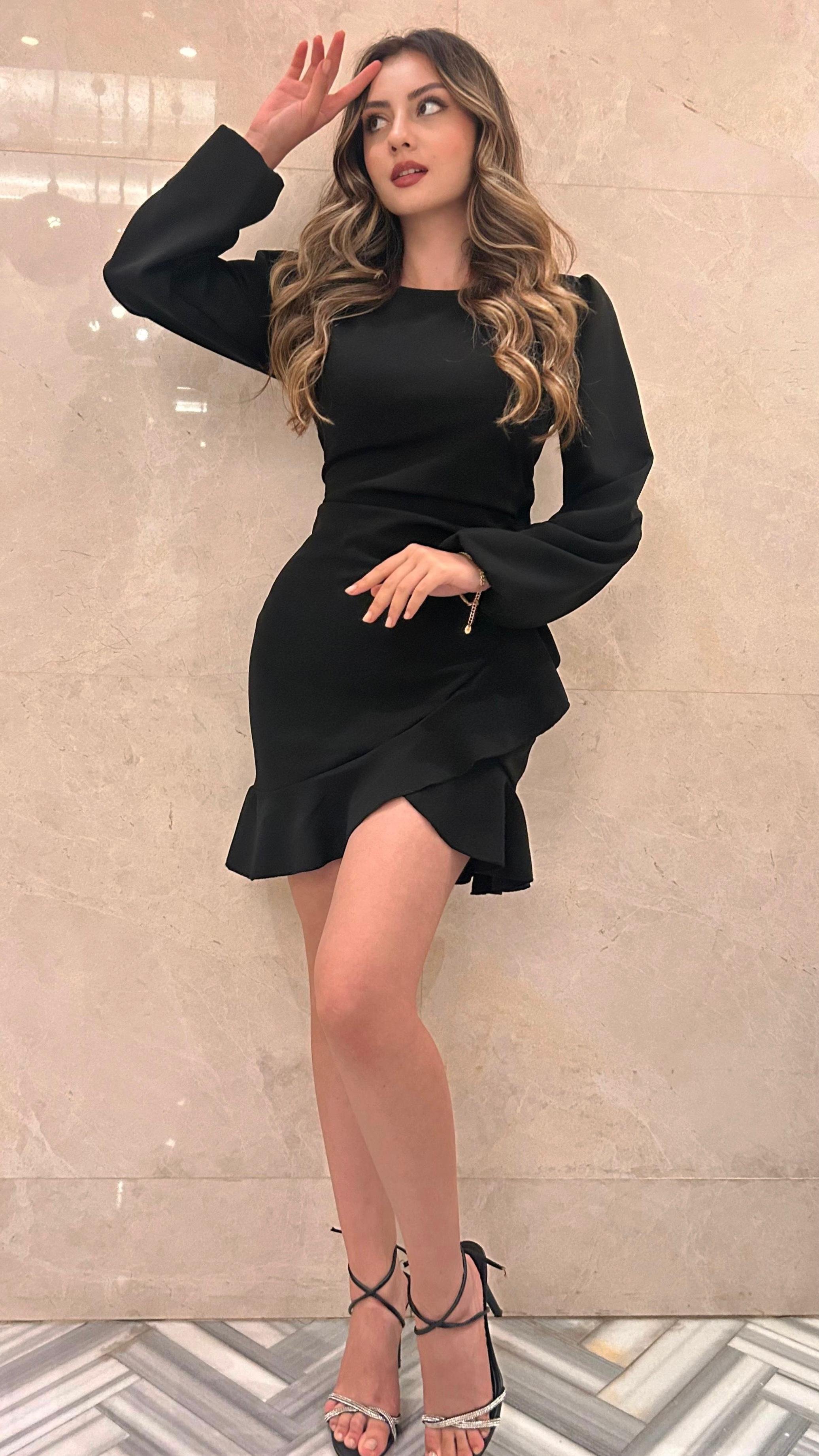 Kadın Uzun Kollu Bisiklet Yaka önden Volanlı Ithal Krep Elbise
