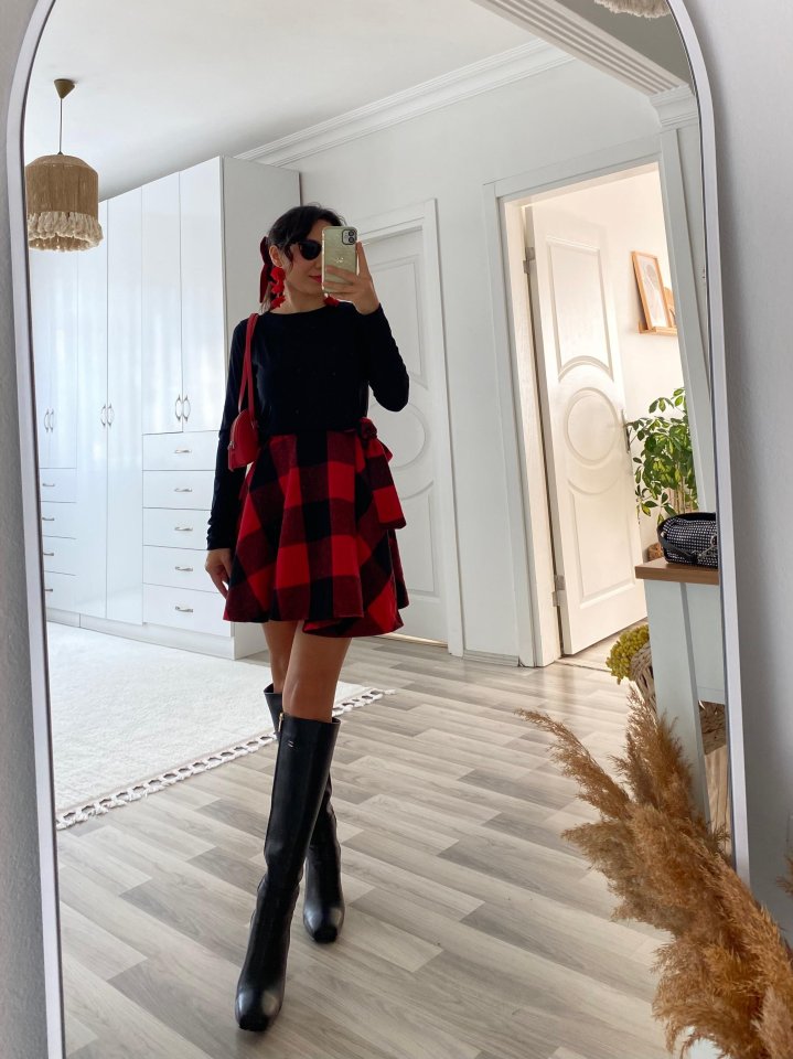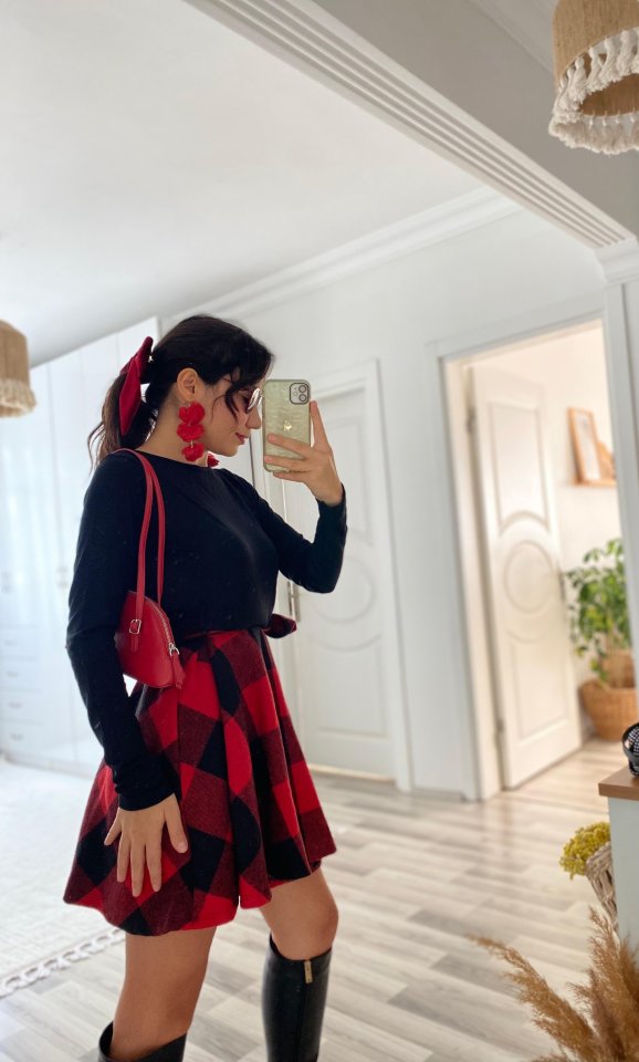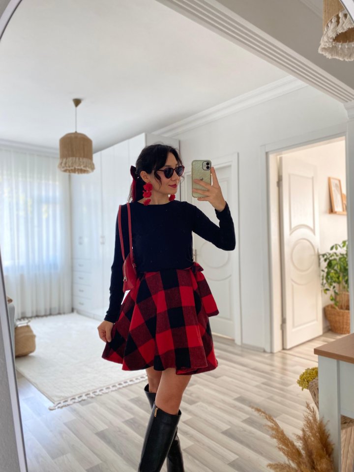 Kadın Uzun Kollu Bisiklet Yaka üst Viskon Alt Ekose Kısa Elbise