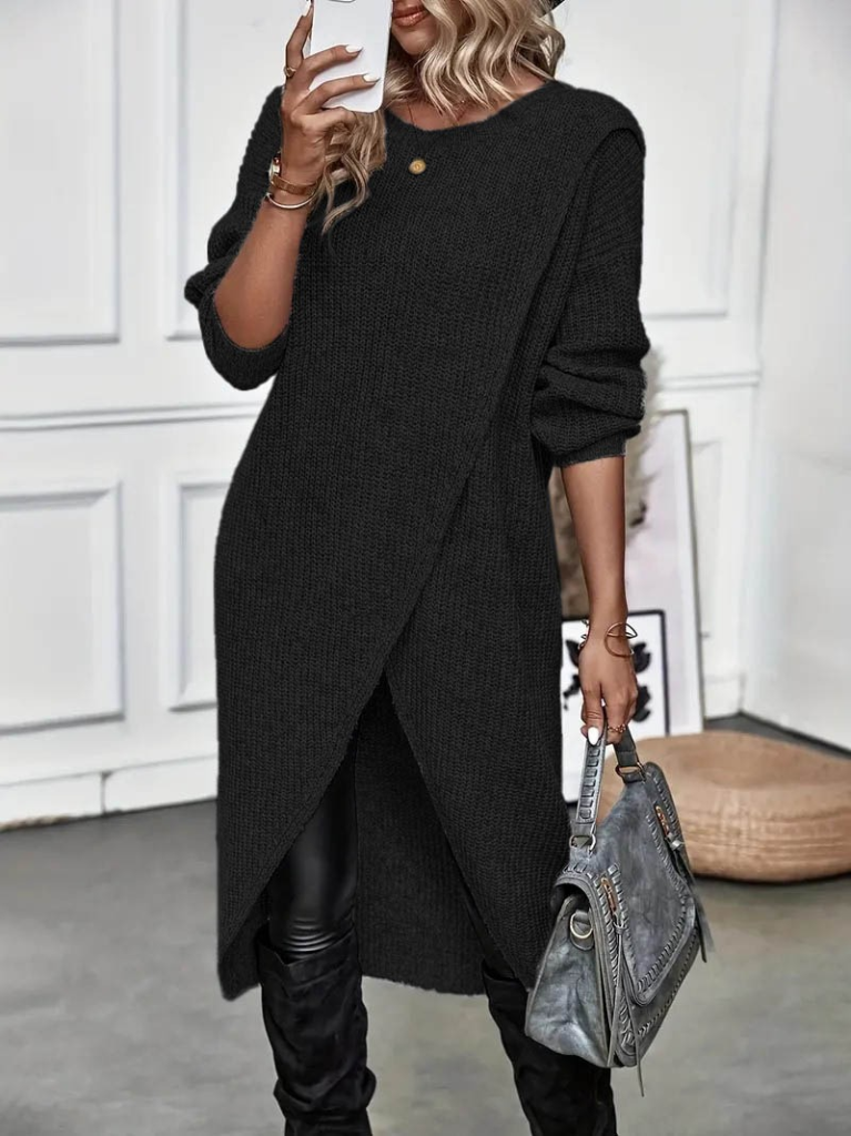 Kadın Uzun Kollu Bisiklet Yakalı önden çapraz Kesim Detaylı Midi Triko Elbise