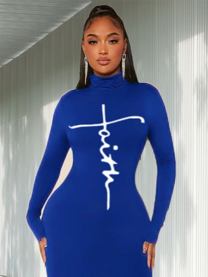 Kadın Uzun Kollu Boğazlı Baskı Detaylı Viskon Tam Boy Elbise