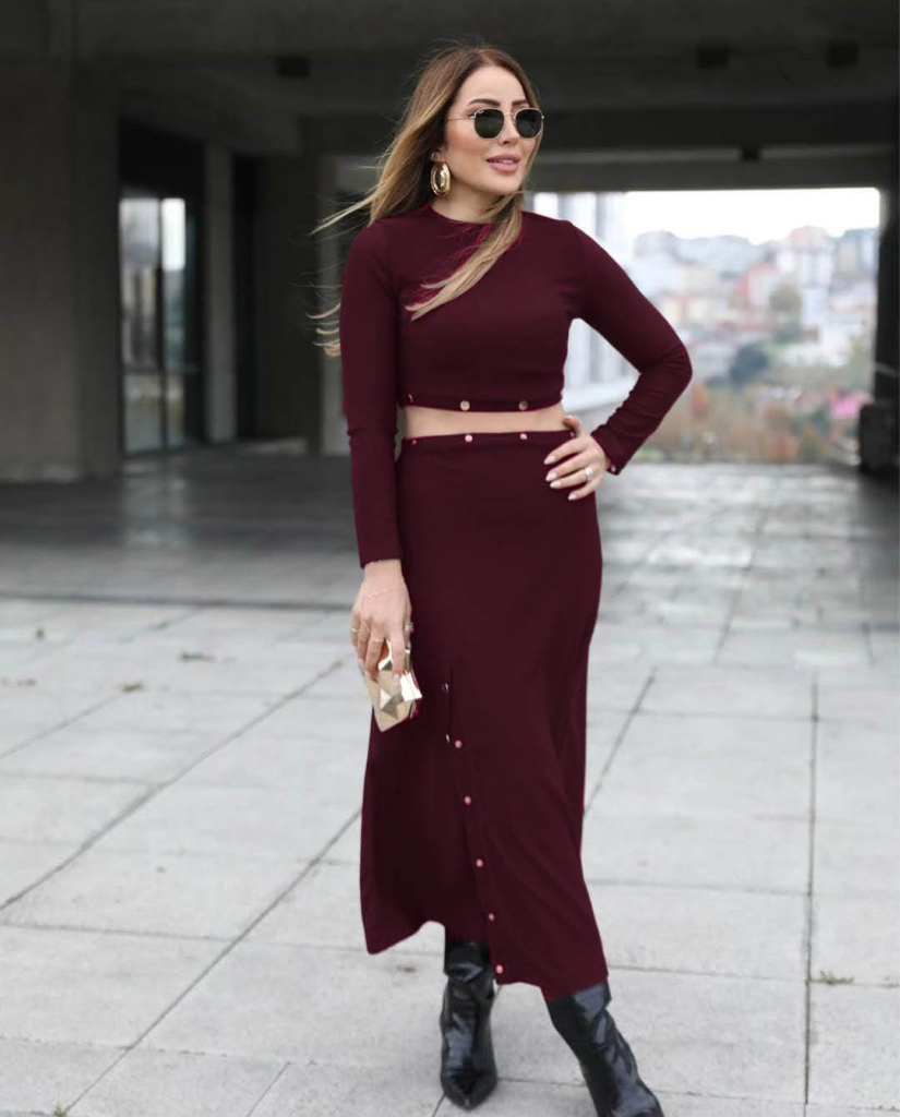 Kadın Uzun Kollu çıtçıtlı Viskon Krop Bluz Ve Yırtmaçlı Etek Istenildiğinde Elbise Olan Ikili Takım