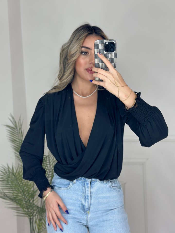 Kadın Uzun Kollu Dökümlü Kruvaze Yaka Kol Ucu Gipeli Sandy Bluz