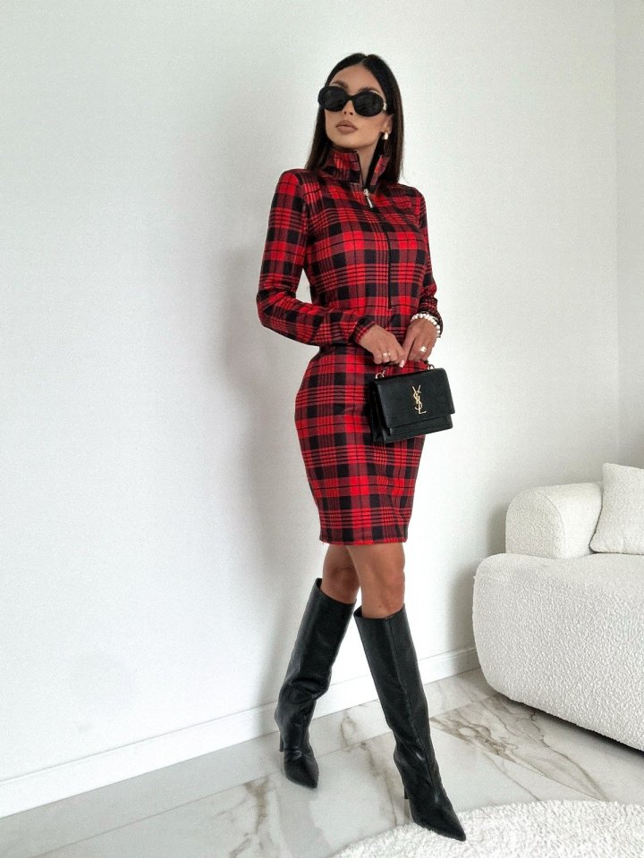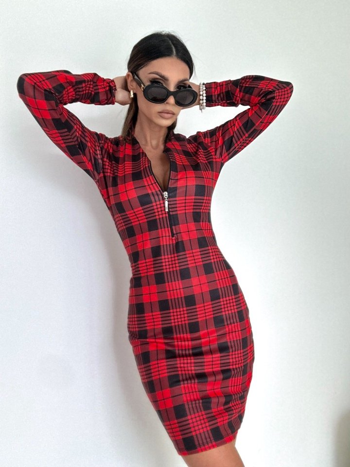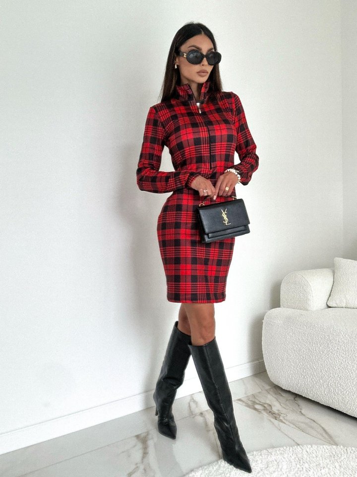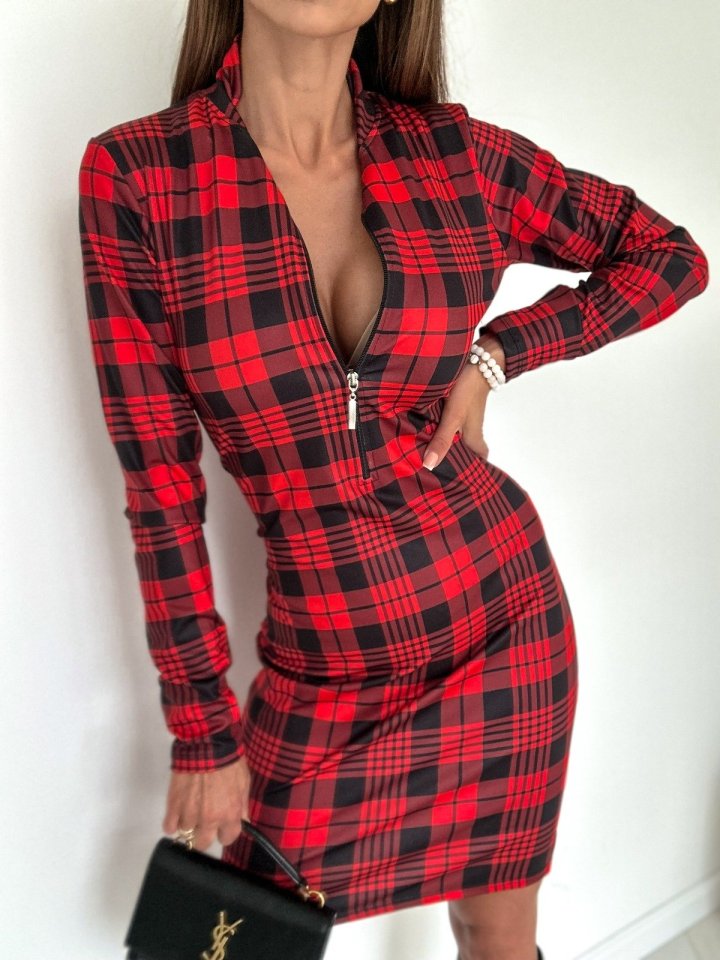 Kadın Uzun Kollu Fermuarlı Ekose Baskılı Dalgıç Elbise