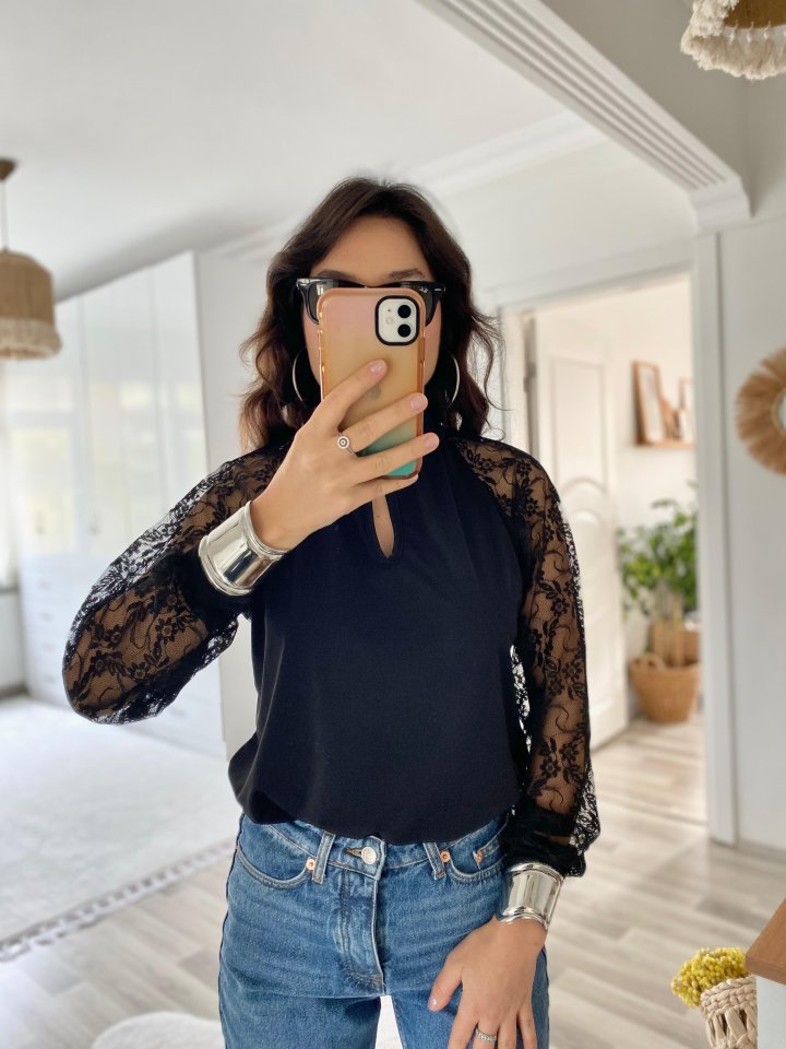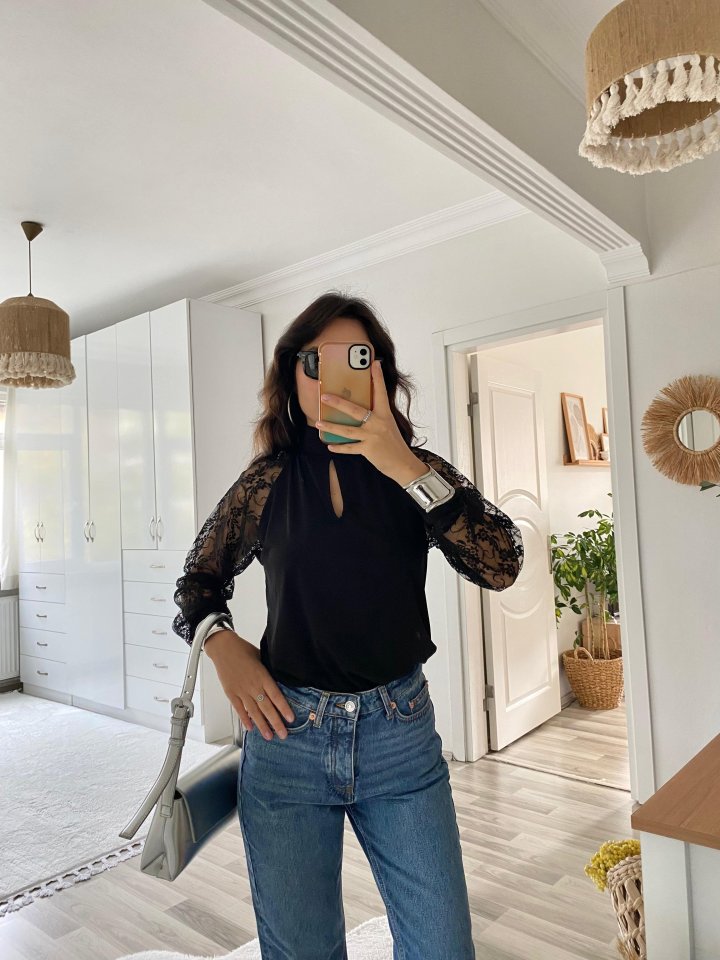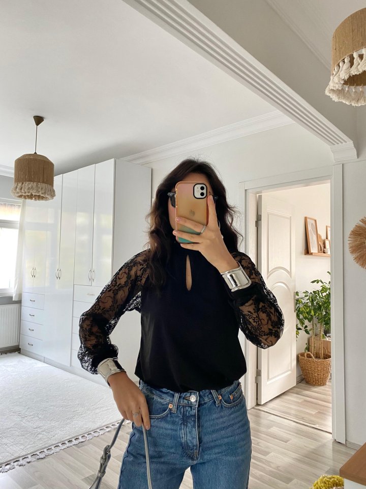 Kadın Uzun Kollu Göğüs Pencere Detay Yaka Boğazlı Kolları Tüllü Sandy Bluz