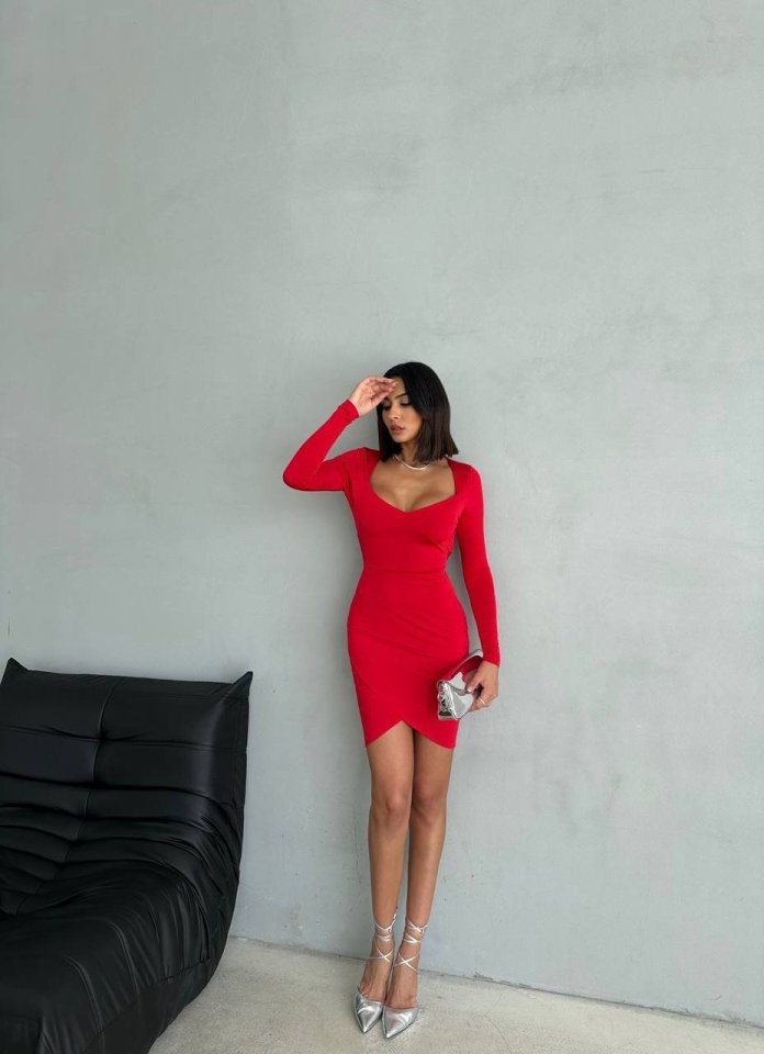 Kadın Uzun Kollu Göğüs Ve Sırt Dekolteli Kruvaze Etek Detay Fırsat ürün Mini Elbise
