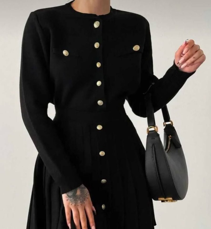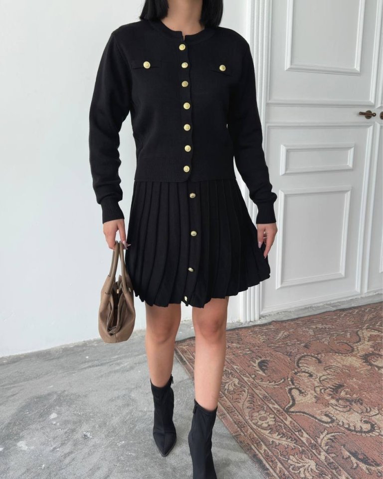 Kadın Uzun Kollu Gold Düğme Detay Yelek Ve Pileli Mini Etek Ikili Takım