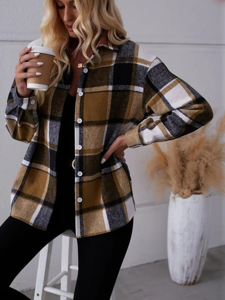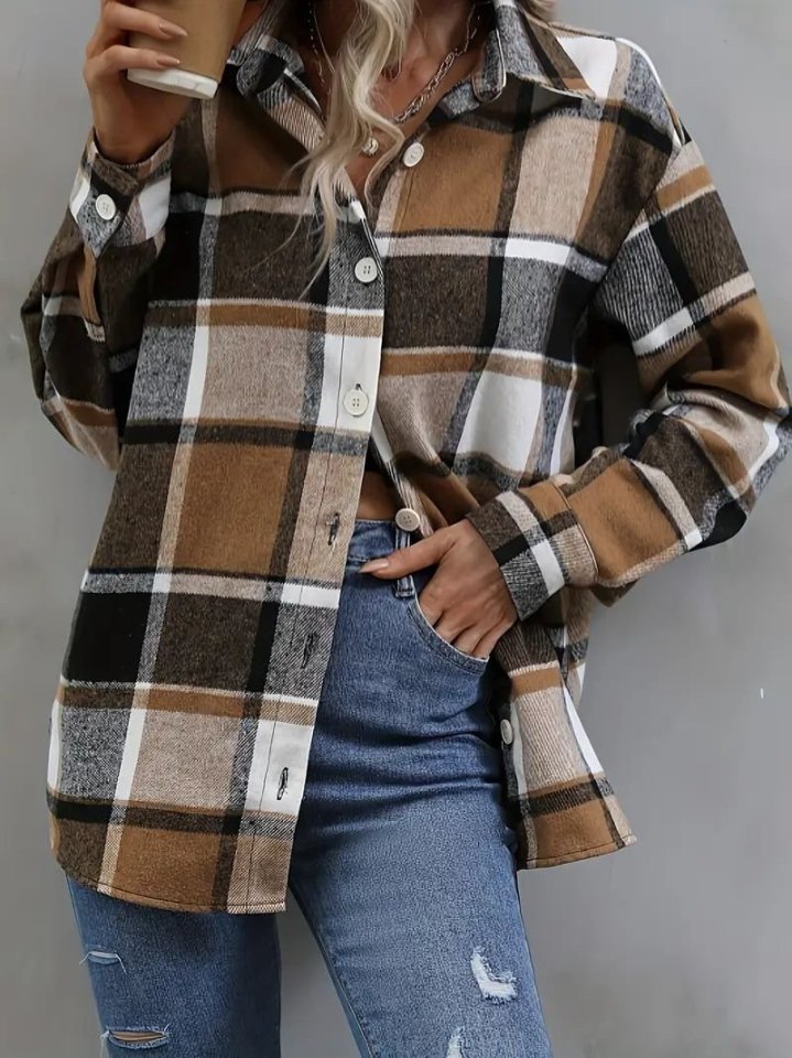 Kadın Uzun Kollu Kare Desenli önden Düğmeli Dokuma Gömlek