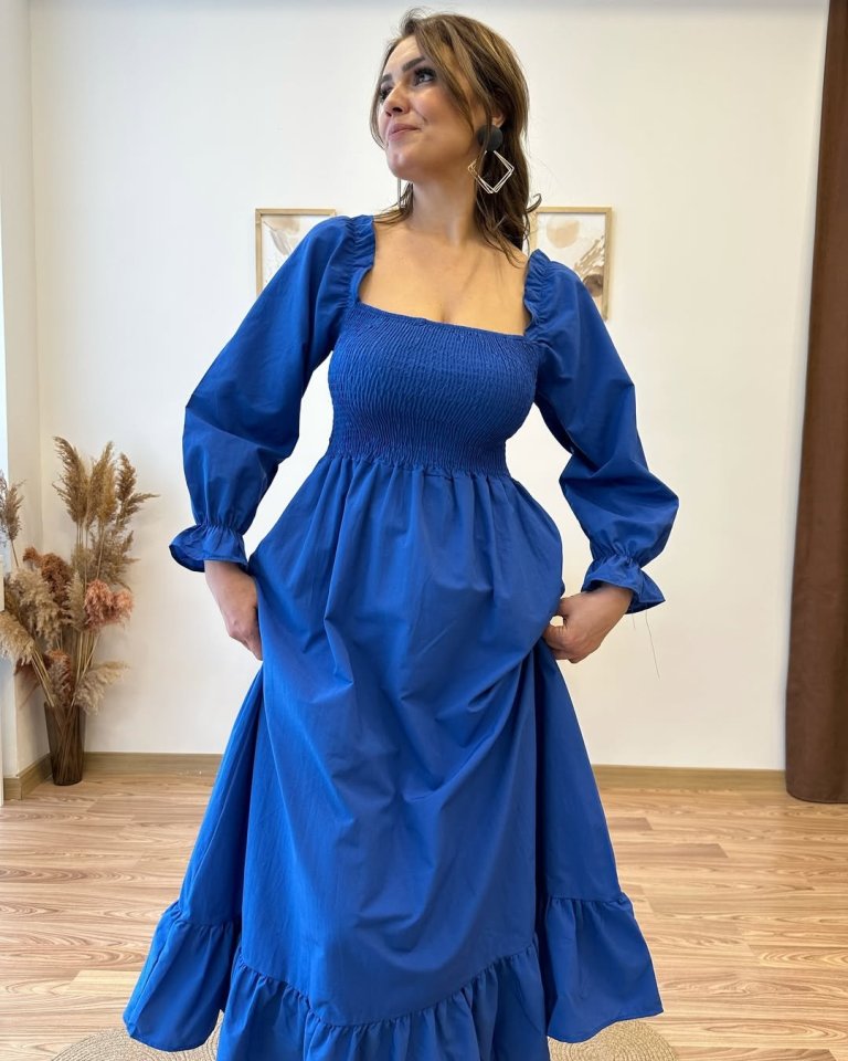Kadın Uzun Kollu Kare Yakalı Gipeli Uzun Trikoton Elbise