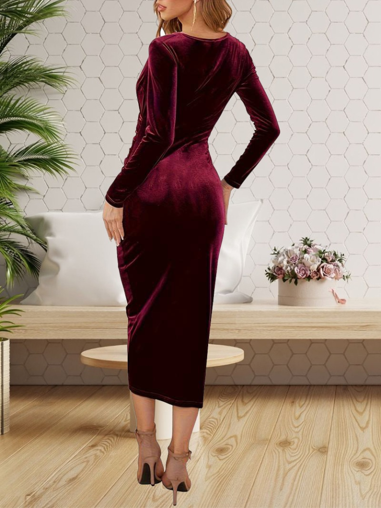 Kadın Uzun Kollu Kruvaze Yaka Belden Büzgü Detay Midi Kadife Elbise