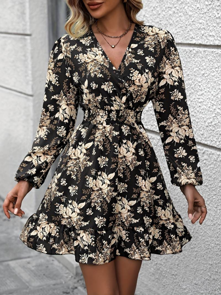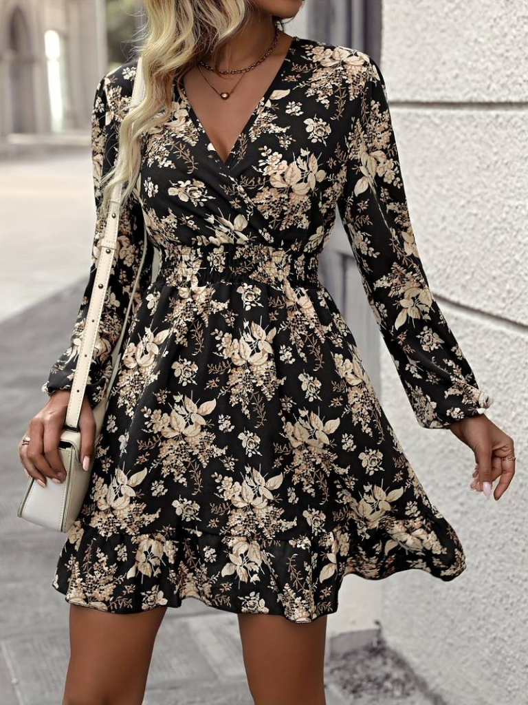 Kadın Uzun Kollu Kruvaze Yaka Beli Gipeli çiçek Desenli Kısa Dalgıç Elbise