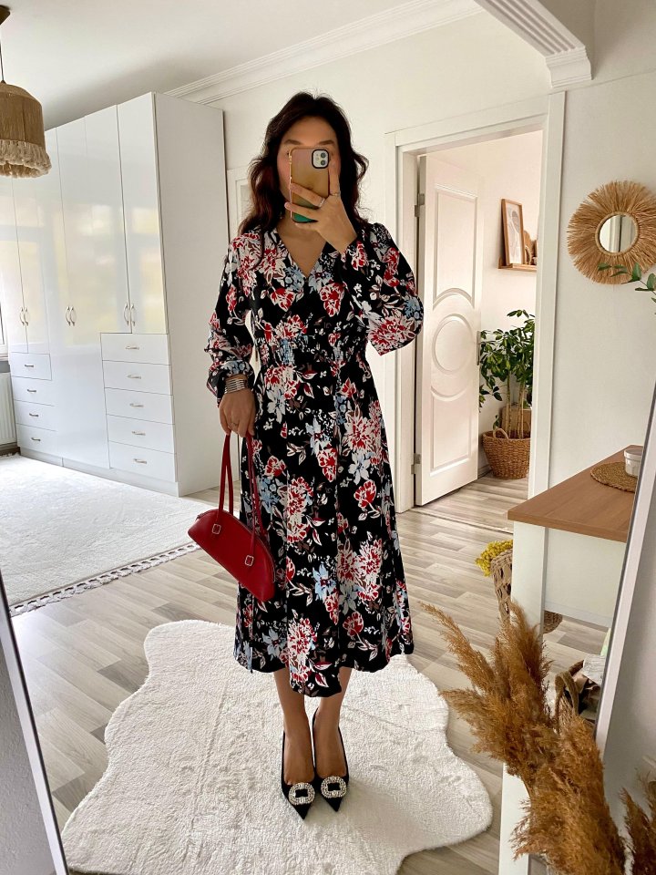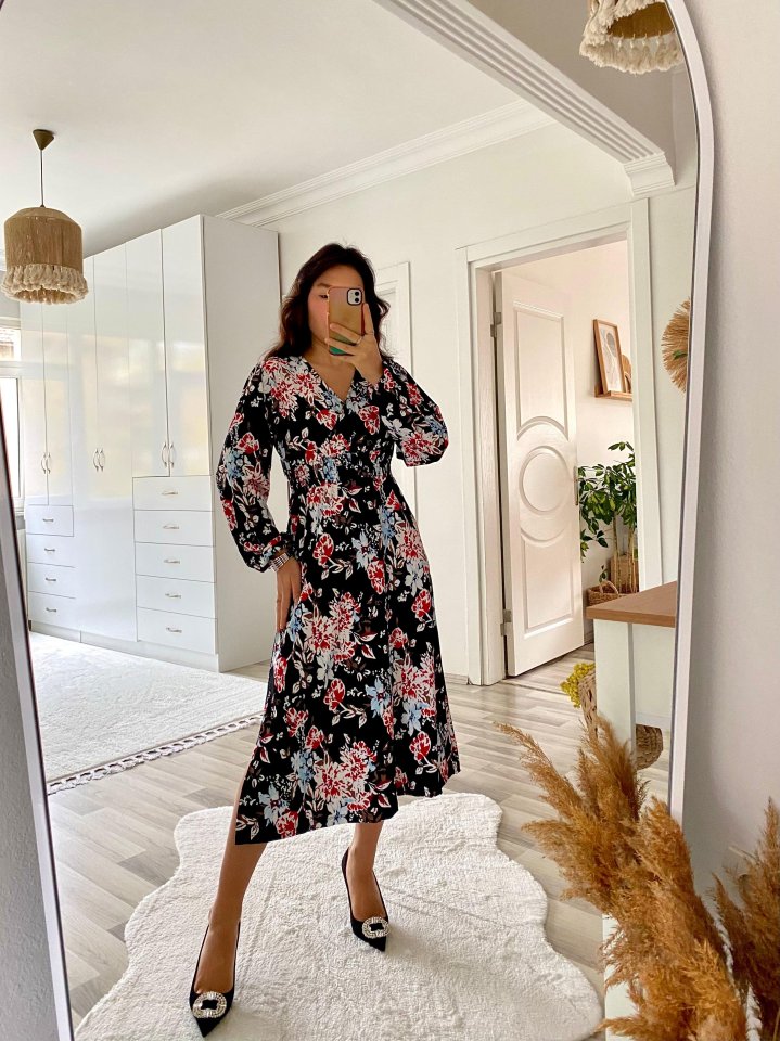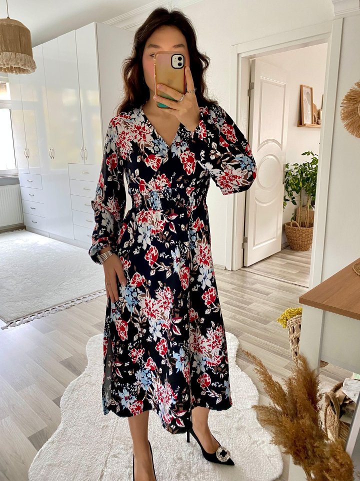 Kadın Uzun Kollu Kruvaze Yaka Beli Lastikli Yandan Yırtmaçlı Desenli Dalgıç Elbise
