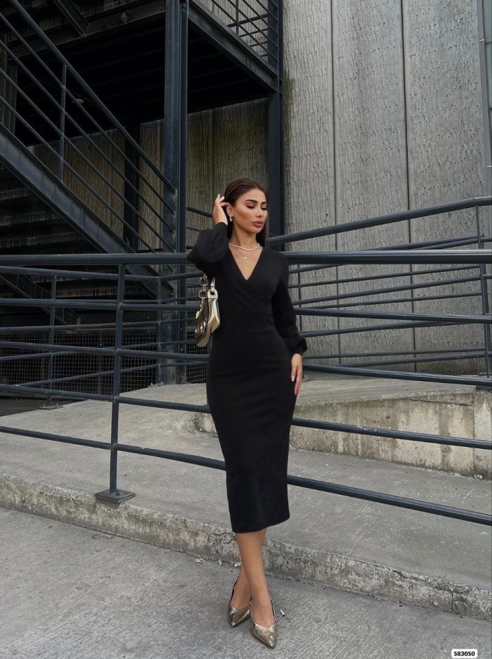 Kadın Uzun Kollu Kruvaze Yaka Büzgü Ve Balon Kol Detay Krep Kumaş Maxi Boy Elbise