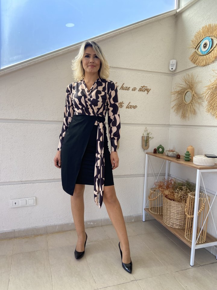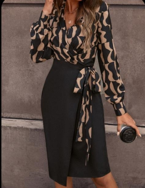 Kadın Uzun Kollu Kruvaze Yaka Dijital Baskılı Fiyonk Detay Dalgıç Kumaş Elbise
