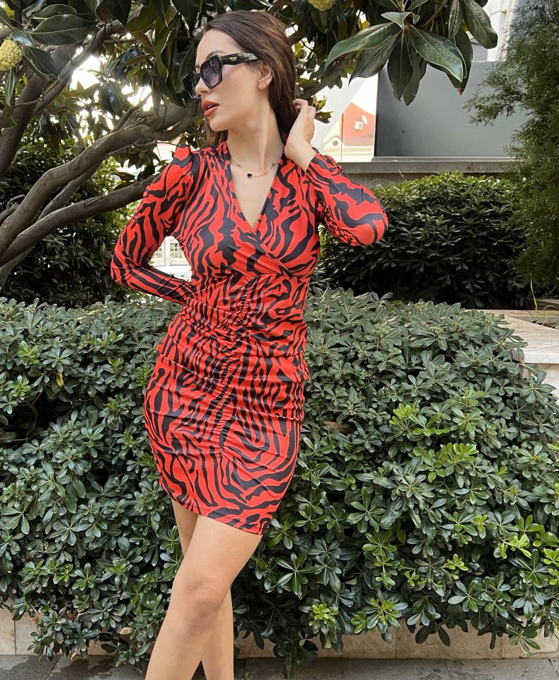 Kadın Uzun Kollu Kruvaze Yaka ön Kısım Büzgülü Zebra Desen Dalgıç Elbise