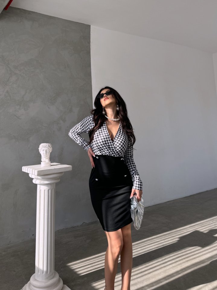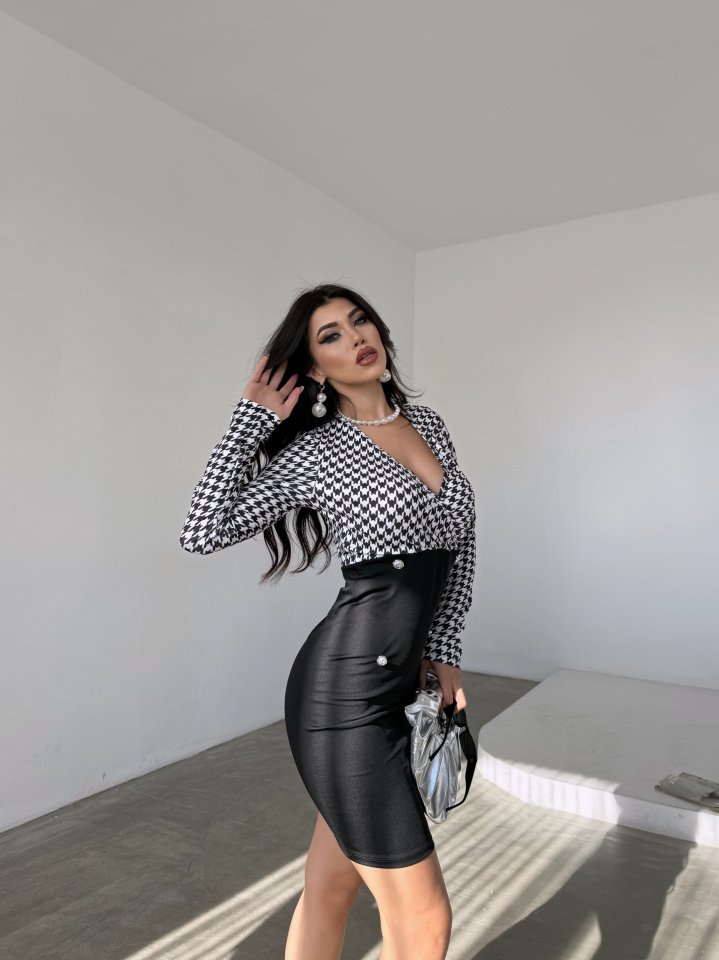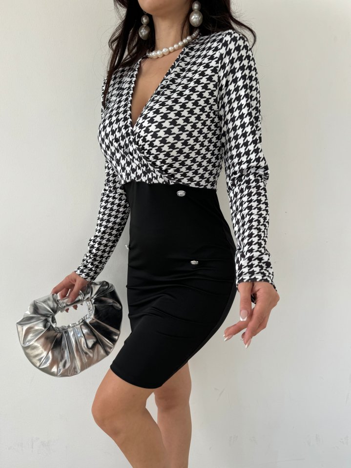 Kadın Uzun Kollu Kruvaze Yaka üst Kazayağı Desen Düğme Detaylı Dalgıç Elbise