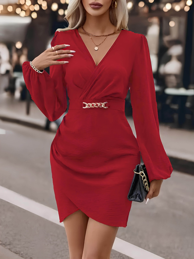 Kadın Uzun Kollu Kruvaze Yaka Yandan Büzgülü Asimetrik Detaylı Ithal Krep Mini Elbise