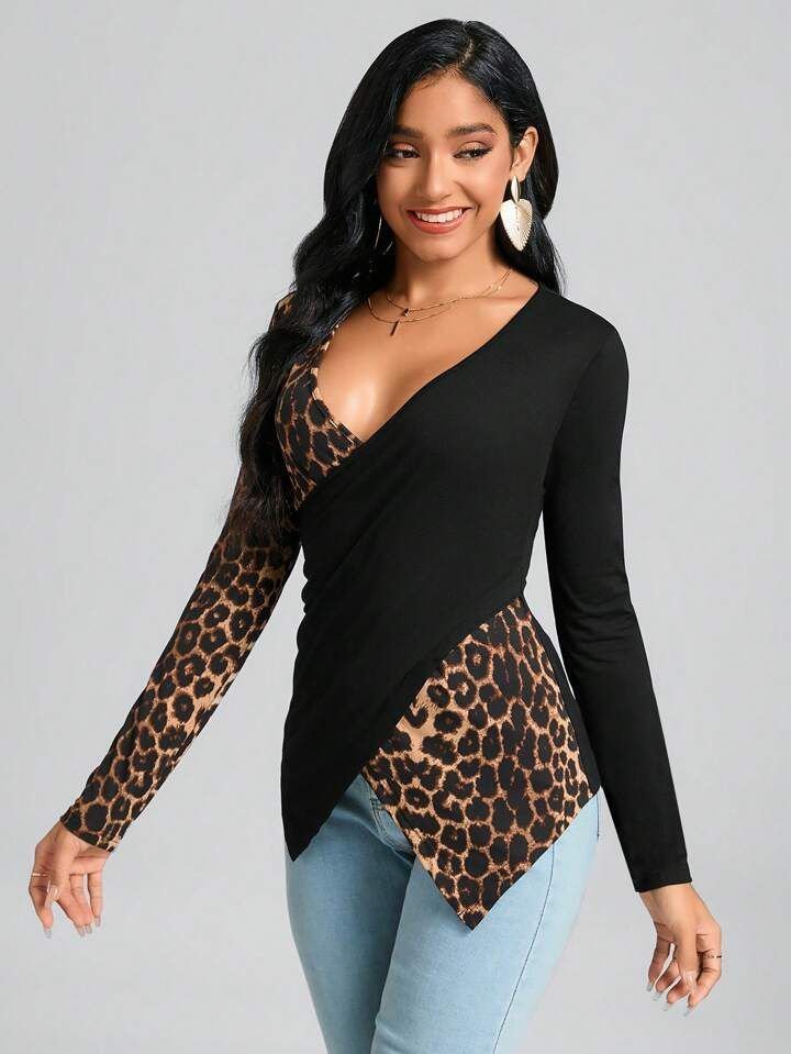 Kadın Uzun Kollu Kruvaze Yakalı Leopar Desen Detaylı Viskon Bluz