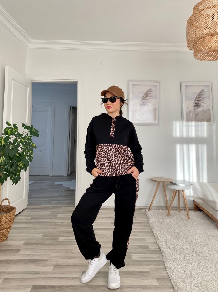 Kadın Uzun Kollu Leopar Detay Sweat Ve Yanı Leopar şerit Detay Pantolon Ikili Takım