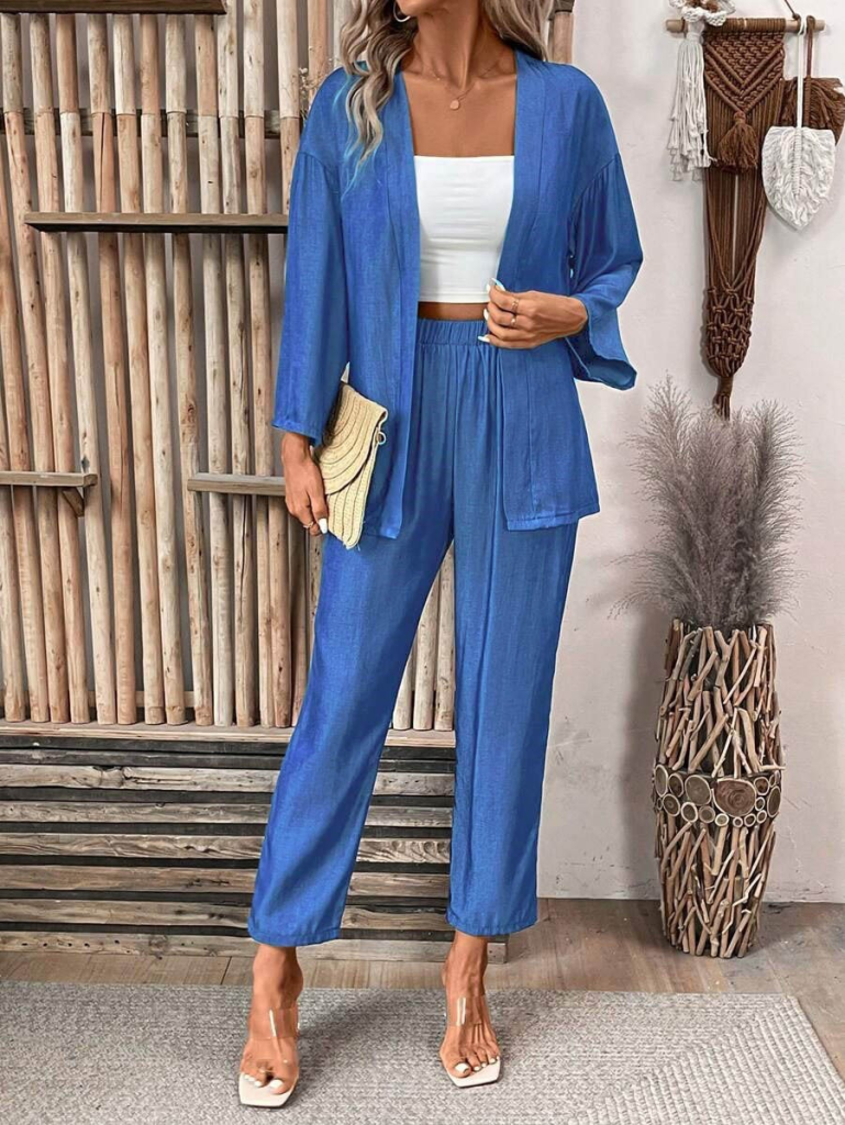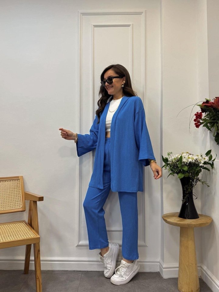 Kadın Uzun Kollu önü Açık Dokuma Ceket Ve Pantolon Ikili Takım