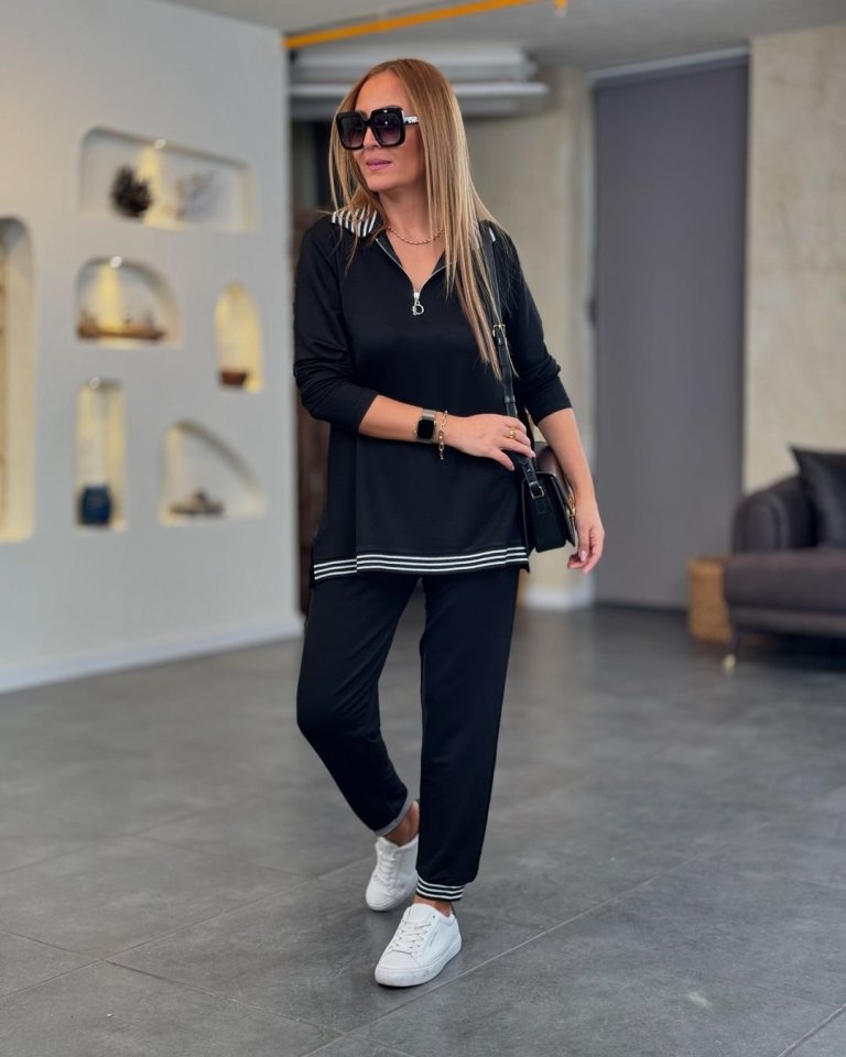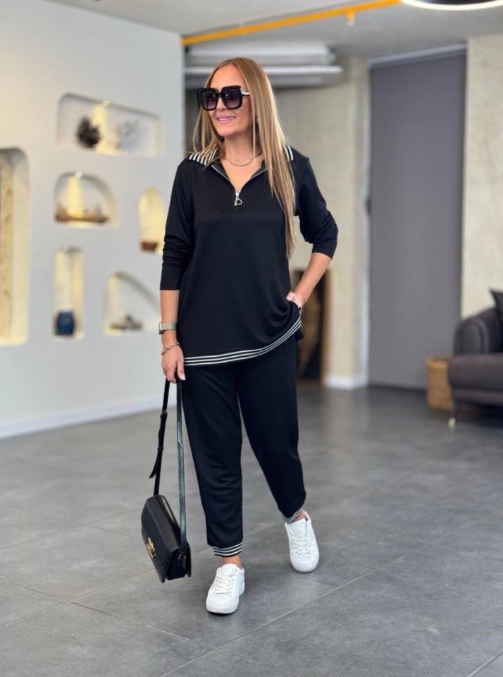 Kadın Uzun Kollu Ribana Ve Fermuar Detay Bluz Ve Yüksel Bel Pantolon 2li Takım