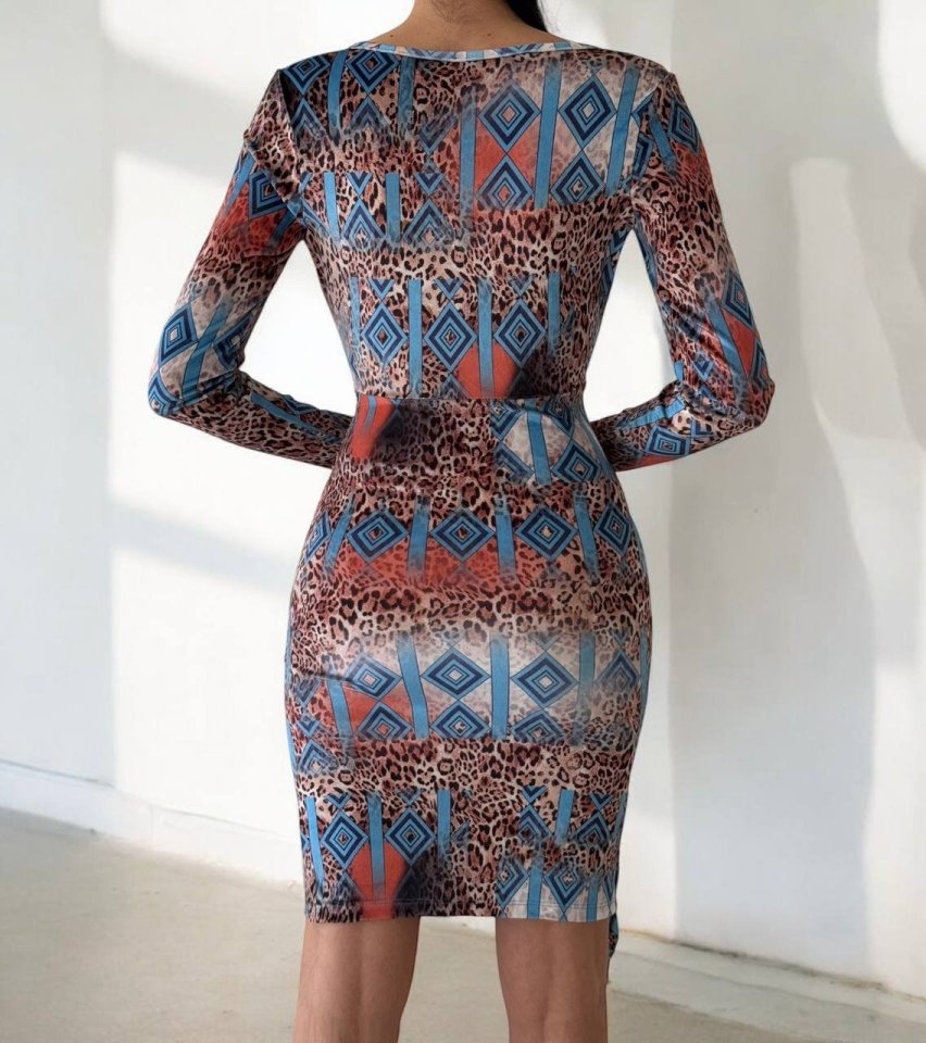 Kadın Uzun Kollu V Yaka Leopar Etnik Desen Fırsat ürün Mini Kruvaze Elbise