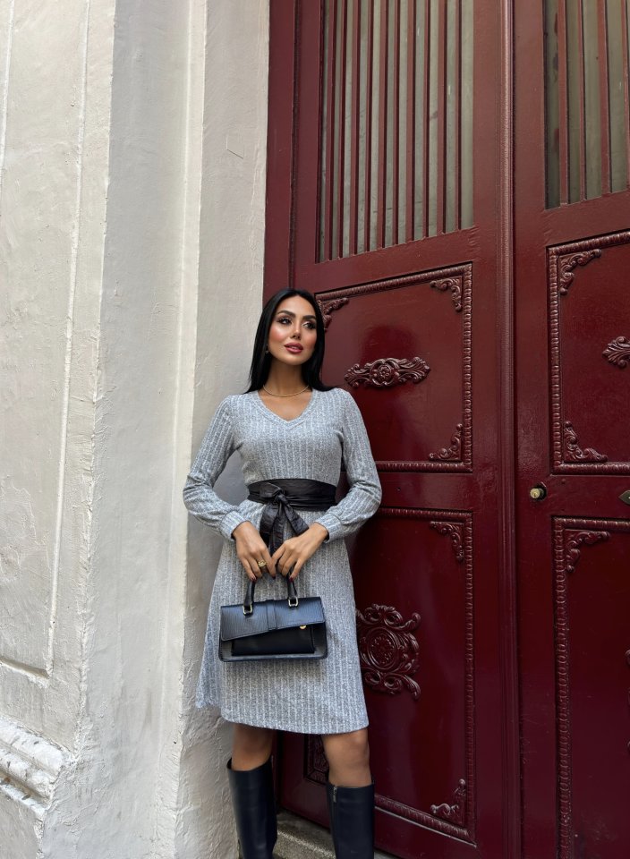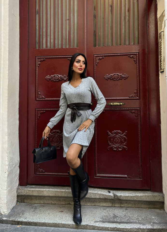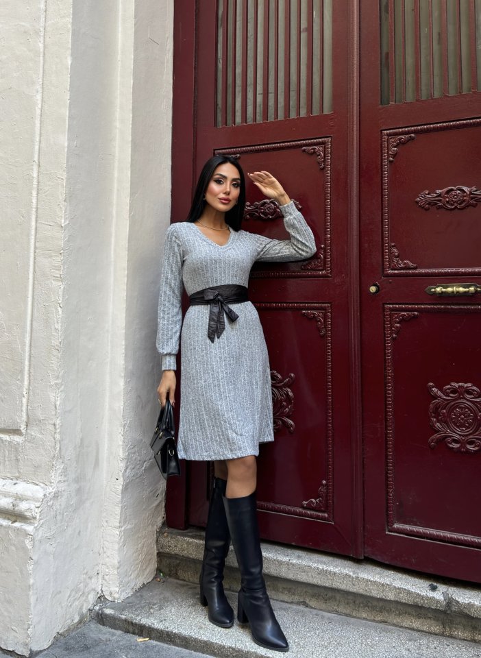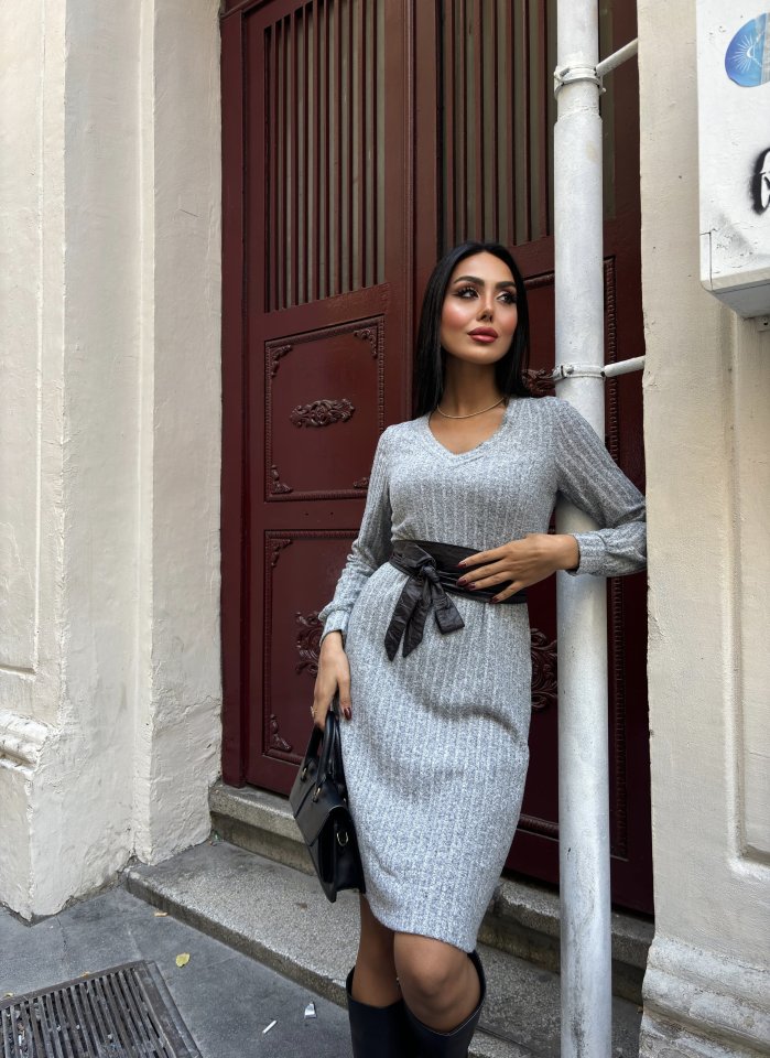 Kadın Uzun Kollu V Yaka Uzun Kol şardonlu Kaşkorse Midi Elbise