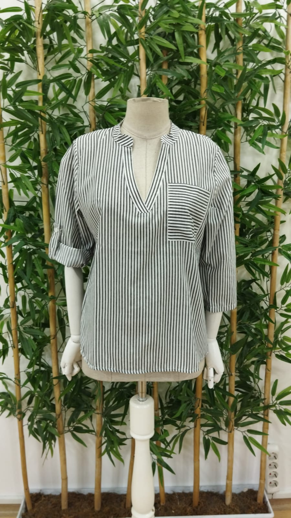 Kadın Uzun Kollu V Yakalı Cepli Dokuma Gömlek