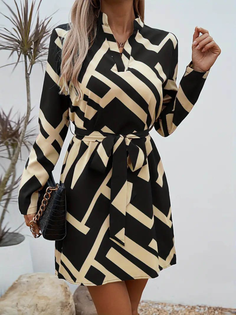 Kadın Uzun Kollu V Yakalı Desenli Belinde Kuşaklı Dalgıç Elbise