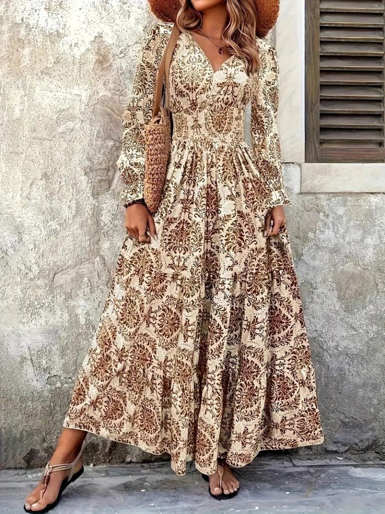 Kadın Uzun Kollu V Yakalı Desenli Süprem Elbise