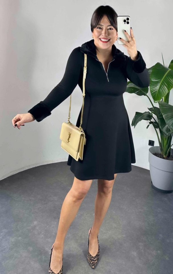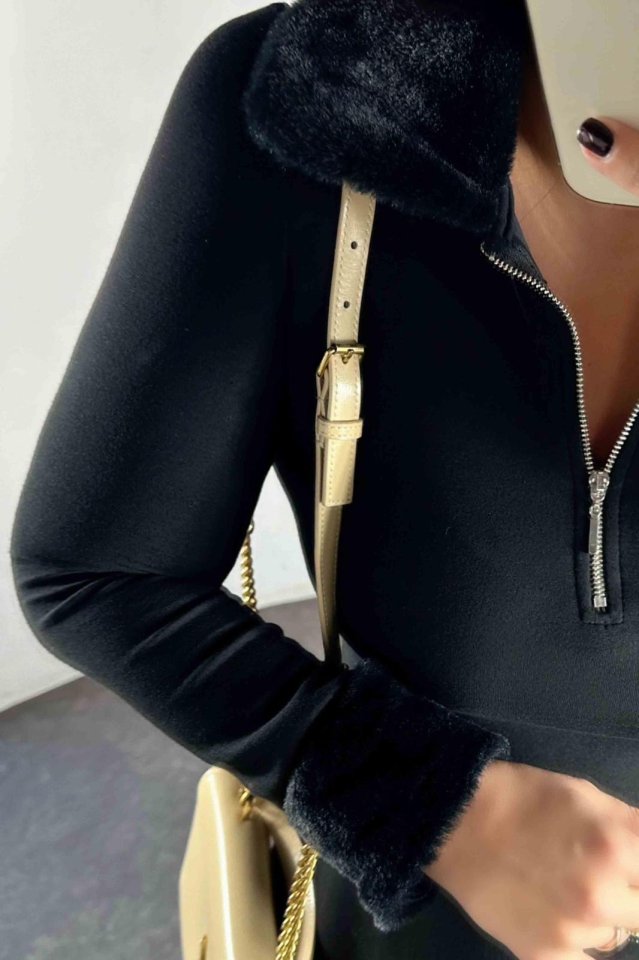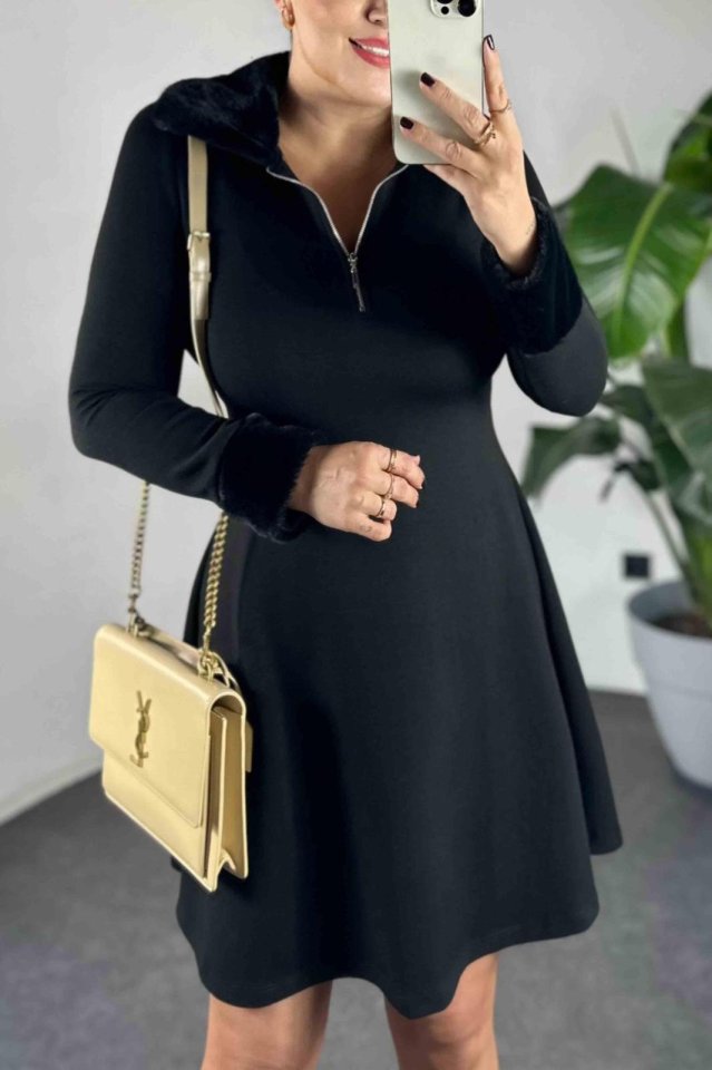 Kadın Uzun Kollu Yaka Ve Manşetleri Peluş Detay Fermuar Dekolteli Mini Elbise