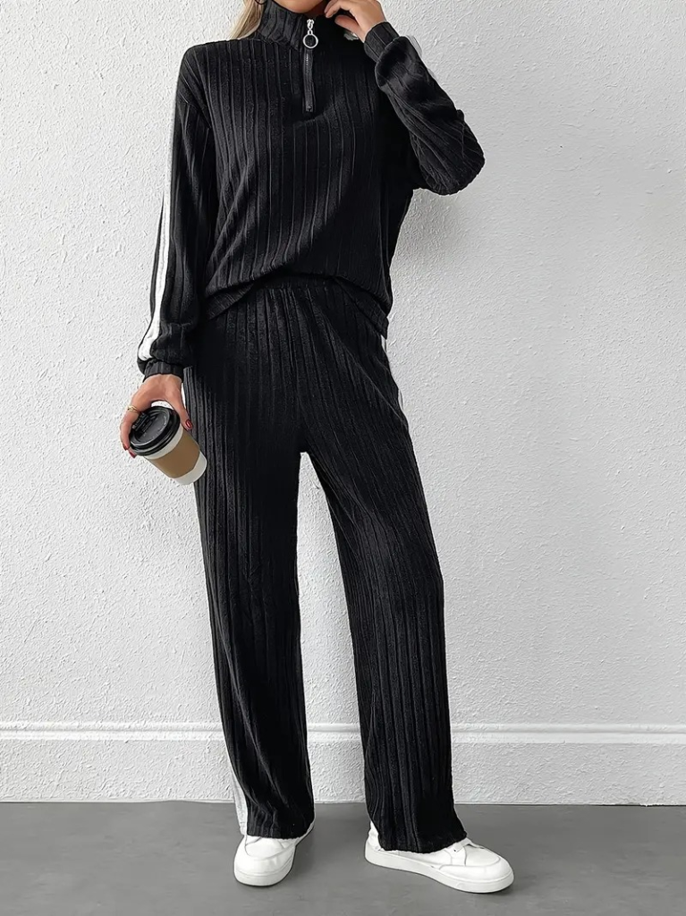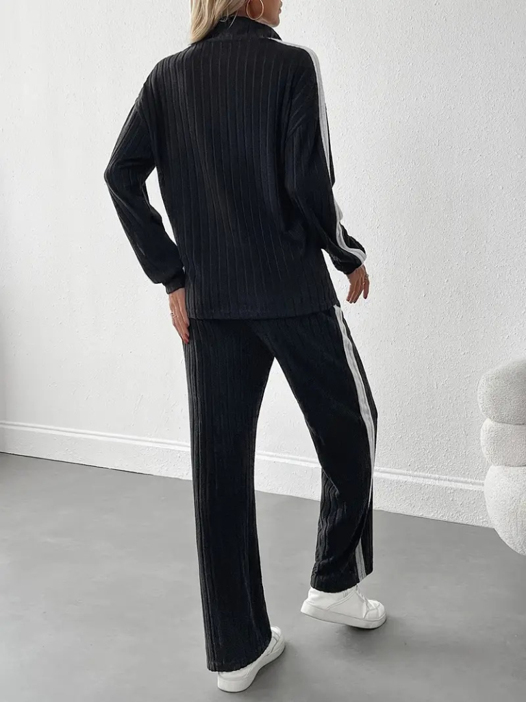 Kadın Uzun Kollu Yakadan Fermuarlı Yanları şerit Detaylı şardonlu Kaşkorse Bluz Ve Pantolon Ikili Takım