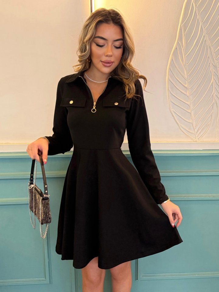 Kadın Uzun Kollu Yakalı Fermuarlı Ve Cepli Kısa Ithal Krep Kısa Elbise