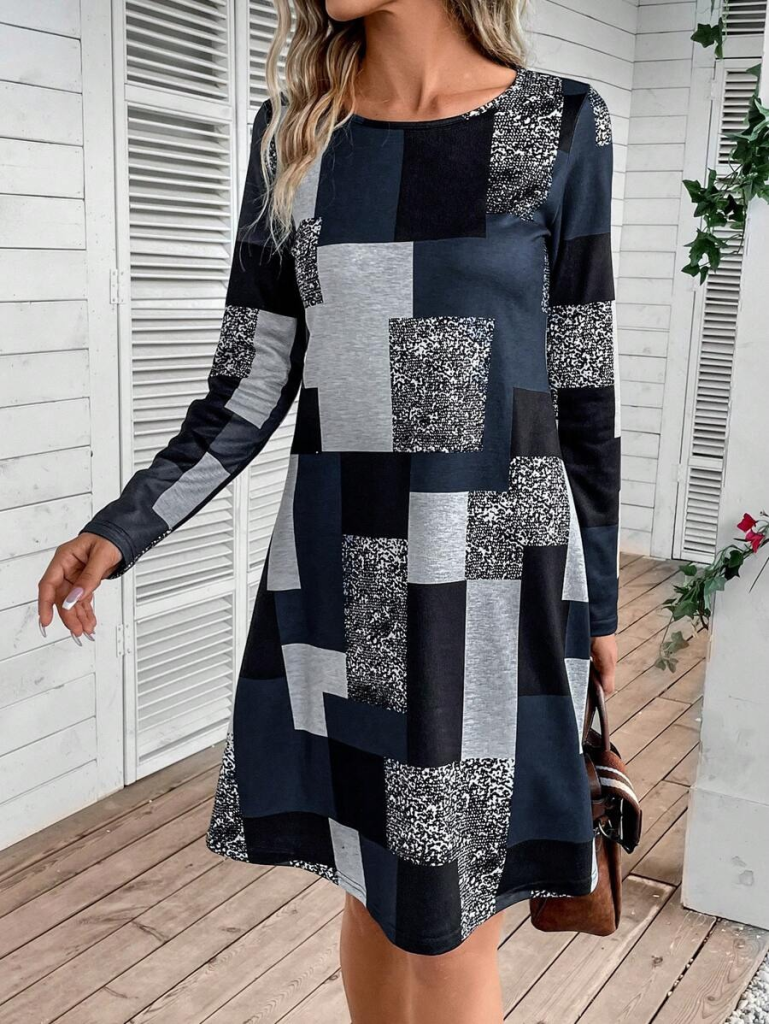 Kadın Uzun Kollu Yuvarlak Yaka Geometrik Süprem Elbise