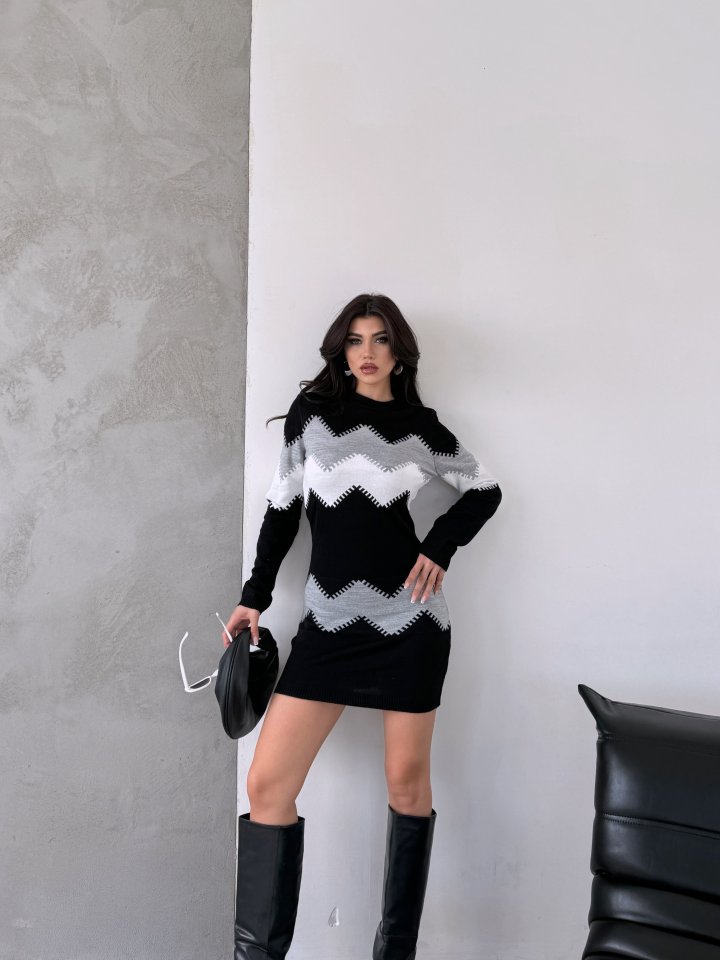 Kadın Uzun Kollu Zigzag Desen Triko Elbise