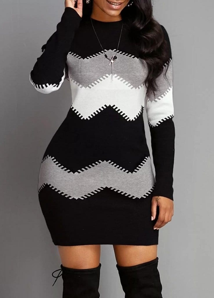 Kadın Uzun Kollu Zigzag Desen Triko Elbise