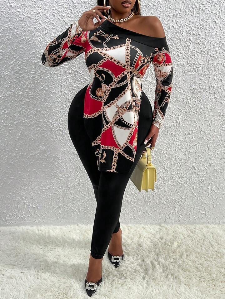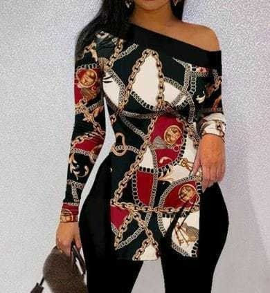 Kadın Uzun Kollu Zincir Desen Tek Omuz Düşük Mikro Bluz