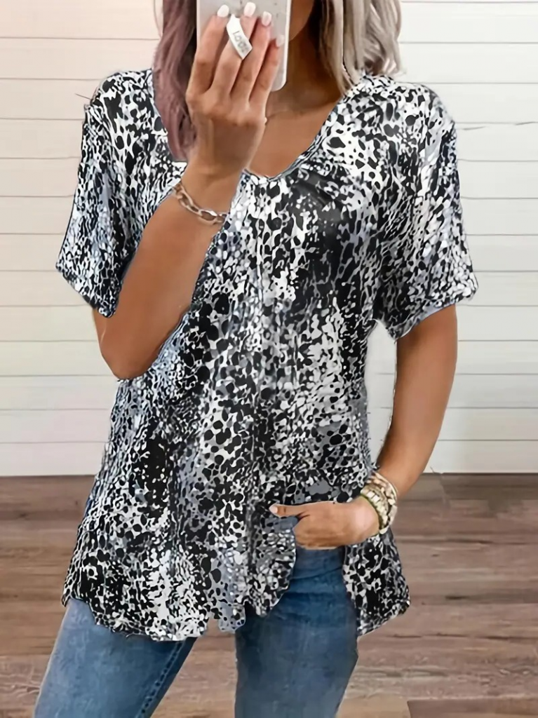 Kadın V Yaka Renkli Leopar Desen Büzgü Detay Süprem Bluz