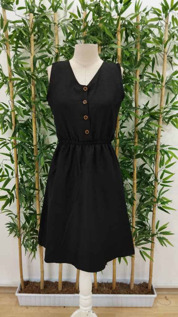 Kadın V Yakalı önden Düğme Detay Beli Lastikli Keten Kısa Elbise