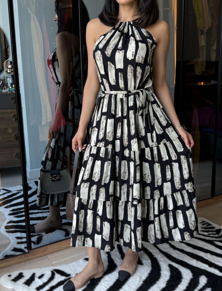 Kadın Viskon Kumaş Ip Askılı Halter Yaka Cepli Midi Boy Elbise