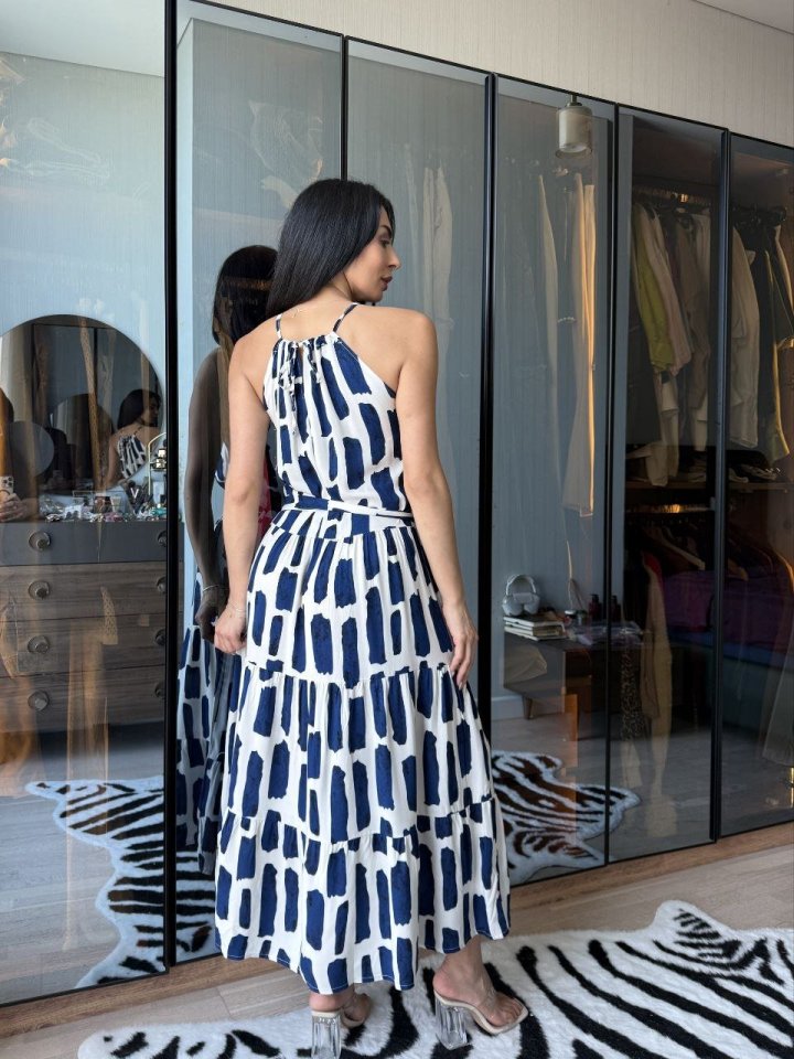 Kadın Viskon Kumaş Ip Askılı Halter Yaka Cepli Midi Boy Elbise