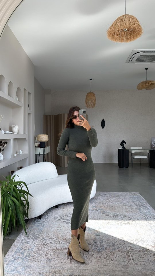 Kadın Yarım Balıkçı Yaka Süet Kumaş Fırsat ürün Midi Boy Elbise