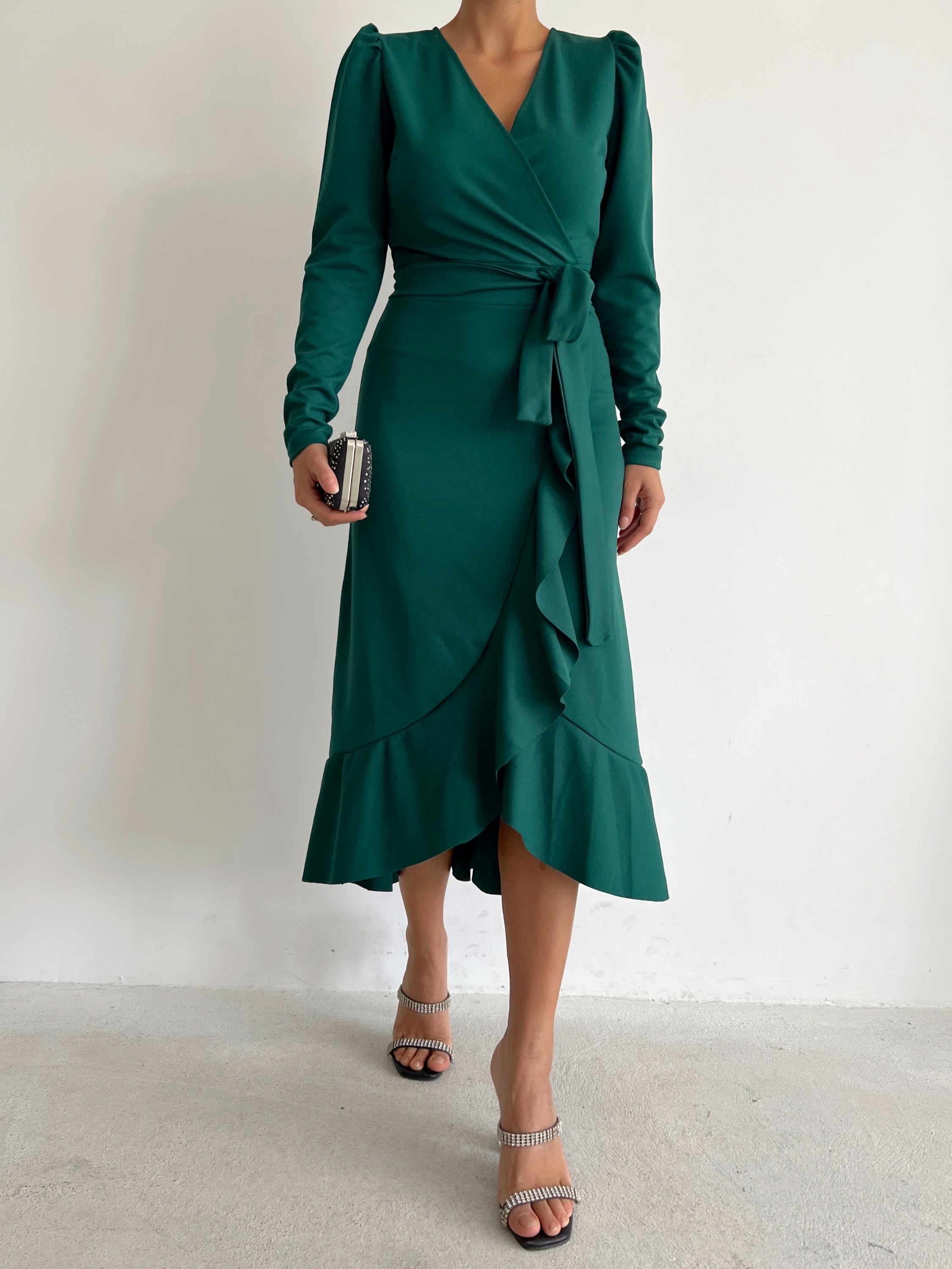 Kadın Yeşil Krep Kumaş Midi Boy Kuşaklı Uzunkol Elbise