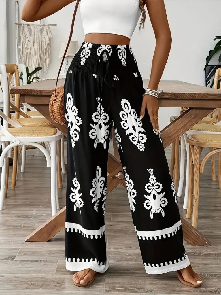 Kadın Yüksek Bel Büzgülü Etnik Desen Baskılı Süprem Pantolon