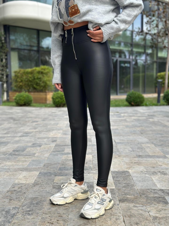 Kadın Yüksek Bel Fermuar Detay Deri Pantolon